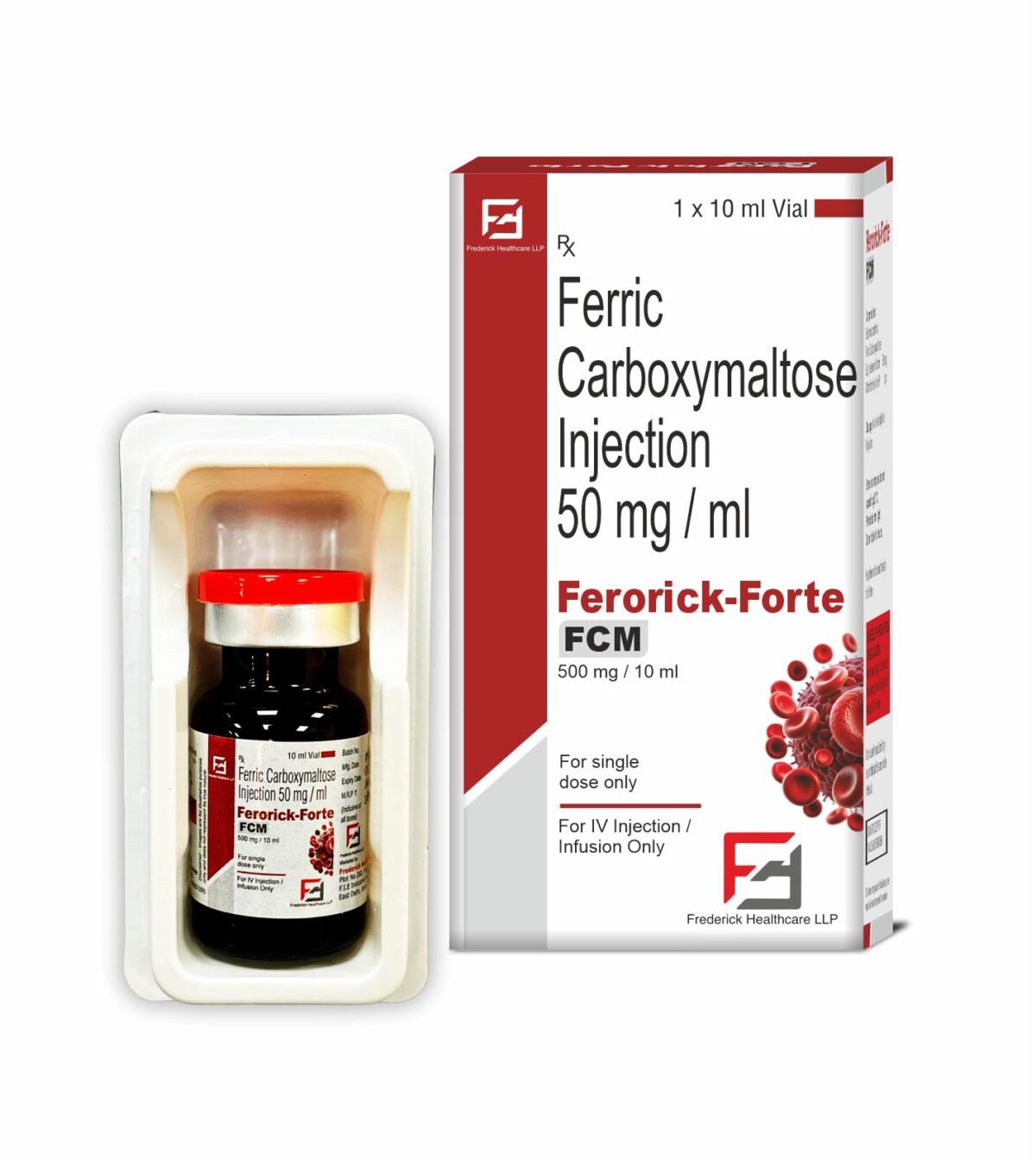 Ferorick-Forte FCM 500mg/10 ml Solution for Injection is an iron replacement medicine. It is used to treat a type of anemia where you have fewer amount of red blood cells due to insufficient iron in your body (iron-deficiency anemia). Iron is needed to produce the red blood cells that carry oxygen around your body.
